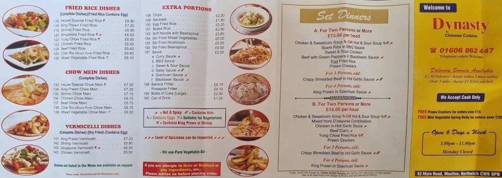 Perched on Main Road in Moulton, Dynasty is a hub of culinary excellence, nestled just a stone's throw from the heart of Northwich. It stands out not only for its delicious food but also its charmingly casual vibe. The wheelchair-accessible dining area invites everyone to enjoy a delightful meal, whether it’s dining in or grabbing a quick takeaway. The free street parking makes it convenient for diners driving in, and with comprehensive amenities like accessible toilets, every guest is welcome. The restaurant shines in the evening when locals flock for dinner, drawn by the unmistakable aromas wafting through the air and the cuisine that promises satisfaction. Those in the know have made Dynasty their go-to for late-night cravings too! With a solid reputation for quality food and speedy service, its popularity continues to grow. Regulars chat and laugh, creating a communal feel that embodies what makes local dining so rewarding.